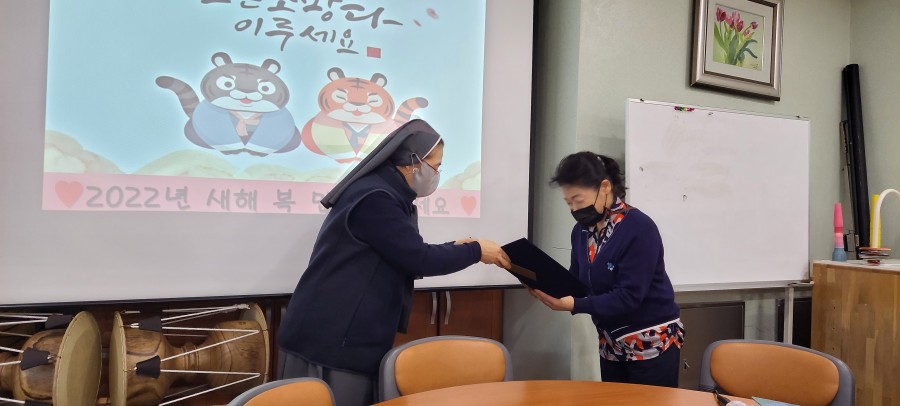 13, 2022년 임인년을 맞이하여 성요셉요양원은 새로운 출발과 앞으로의 다짐을 함께 하는 시무식을 거행하였다. 원장님의 덕담과 어르신 섬김, 서로 배려와 사랑을 만들어가는 행복한 우리집이 되도록 노력하는 다짐의 시간이였다. 특히 최현욱 선생님에게 10년 장기근속상을 수여하여 그동안의 노고를 치하하였다.